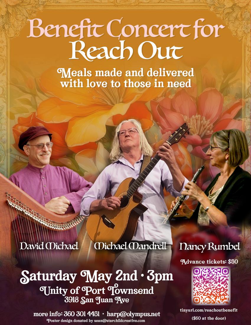 Grammy-winning woodwindist, Nancy Rumbel, finger-style guitar maestro, Michael Mandrell and yours truly on Celtic harp will be performing in Port Townsend on Saturday afternoon, May 2, at 3pm.